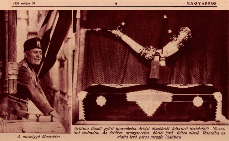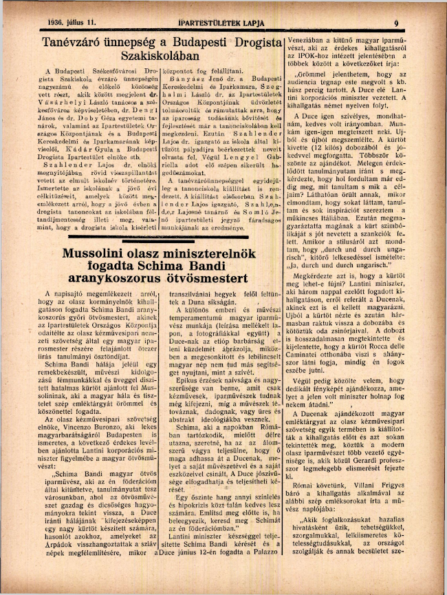 Ha már a legutóbbi bejegyzésben egy grafika kapcsán említésre került Schima Bandi egykori győri ötvösmester és grafikus, folytassuk a sort ismét vele. Az alábbi, 1936. júliusában a standokra került újságból nem csak azt tudhatjuk meg, hogy az említett művész személyesen adhatta át az olasz diktátornak az általa készített díszkürtöt, de egyúttal azt is, hogy Magyarországon ekkor működtek "drogista szakiskolák" (legalábbis a székesfővárosban egy egészen biztosan). Enjoy it!