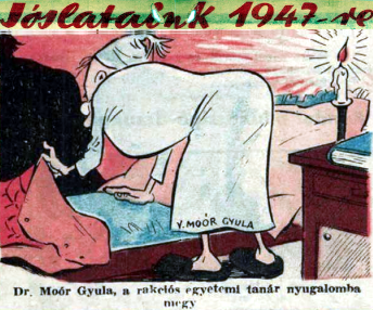 1946 szilveszterén (II. évfolyam, 52. szám) a "szatirikus hetilap" már kóstolgatni kezdte Moórt: 1947-re szóló jóslataik/vágyálmaik egyike volt, hogy nyugdíjazzák a professzort: