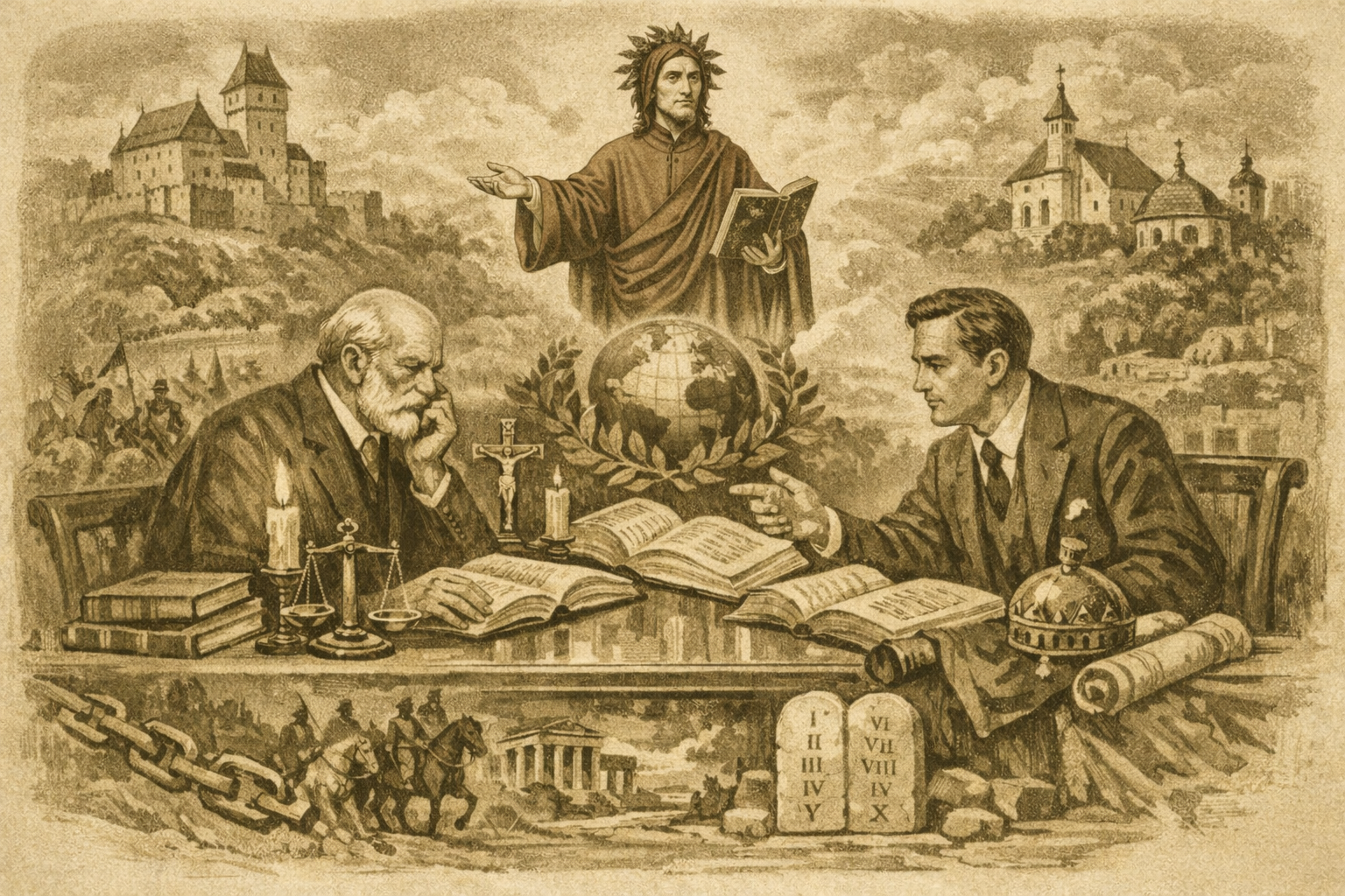 Akkor írta ezeket a sorokat Dante, amikor a keresztény univerzalizmus már régen felbomlott, amikor már két város sem értette meg egymást, mert az egyik fél guelf volt, a másik pedig ghibellin. Már akkor meglátta, hogy a sok küzdelemnek, meg-nem-értésnek az alapja, mely népeket és városokat állított egymással szembe, és gyökere az volt, hogy az emberek „vakok a természet hajlamára“. Dantéban élt még a középkori szentágostoni gondolat. Nemcsak a Divina Comediában látszik ez, melyben szintézisbe hozta a középkori világnézetet, és mintegy pontot tett a középkori szellemi életre, hanem egyéb műveiben is. A Monarchiában világcsászárságról álmodozik. A sok zűrzavar, diszharmónia és háború közepette az egyes ember nem lehet boldog, mert hiszen a boldogság feltétele a béke. Szükséges tehát, hogy a városok, népek és országok felett olyan egyetemes tekintély uralkodjék, aki a filozófia világosságának fényénél, az igazság sugallatára hallgatva, minden kapzsiságot levetkőzve, megakadályozza a pártoskodást, vetélkedést és a háborút. Ez a legfőbb tekintély: a világcsászár. Nem puszta emlék a múltból, hanem biztosíték a jövő számára. Dante ettől a császártól pacifizmust várt. Mindezt azonban azért tartotta szükségesnek, mert az emberek nem eléggé keresztények, és nem hallgatnak a „természet hajlamára”.